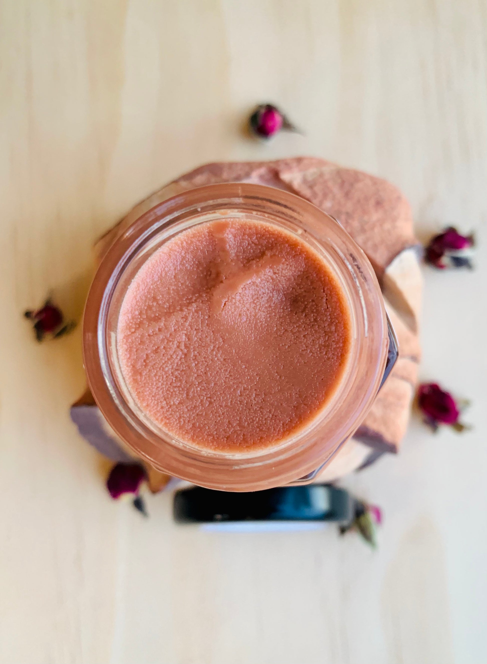 Shea Butter, Arrowroot Powder, Coconut Milk Powder, Safflower Oil, Grapeseed Oil, Jojoba Oil, Rosehip Oil, Castor Oil, Moroccan Red Clay, Rose Essential Oil (with distillates of geranium, neroli, prima rosa, citronella) Kaolin Clay