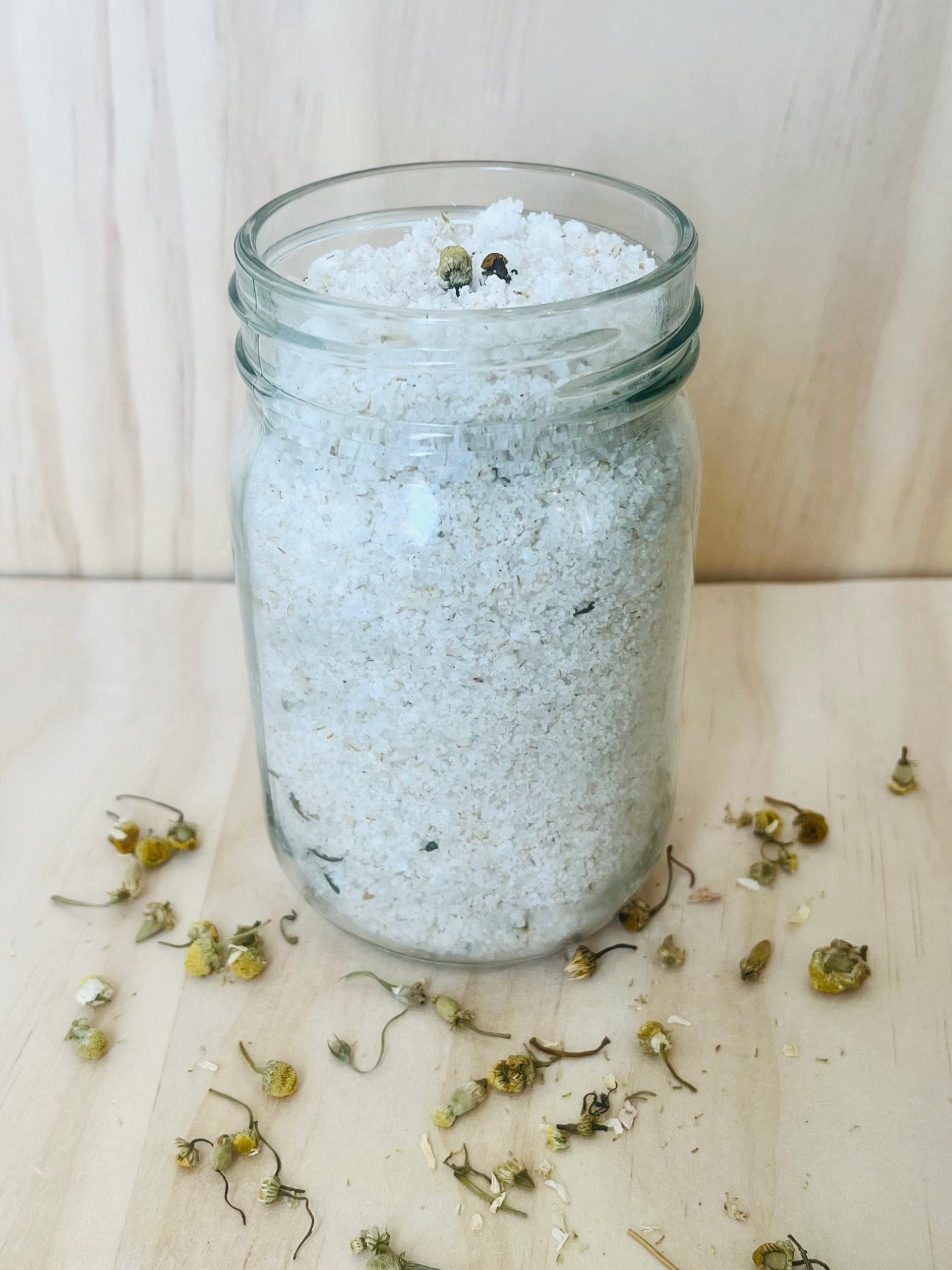 Epsom Salt, Dead Sea Salt, Citric Acid, Baking Soda, Coconut Milk Powder, Ashwagandha, White Willow Bark, Chamomile Buds, Essential Oils: Frankincense, Sage and Myrrh